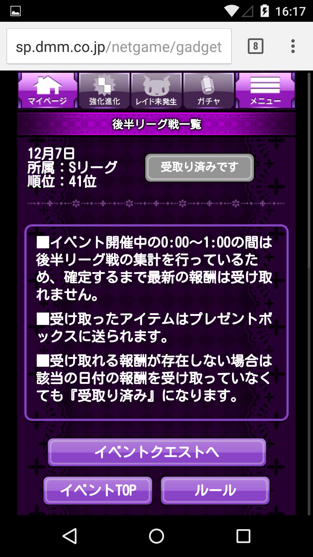 とりあえず、後半戦は無理をせずに、SランクからさっさとAに落ちて、その後はAランクを維持してえろモングミを集めたいと思います。今回の総合100位以内の景品の子が前から欲しかった子の3回目のリメイクでして、この100位報酬の子ってその内えろモングミ70個~80個で交換できるようになるんで。頑張ってそのときが来るまでに溜めておかなくちゃw