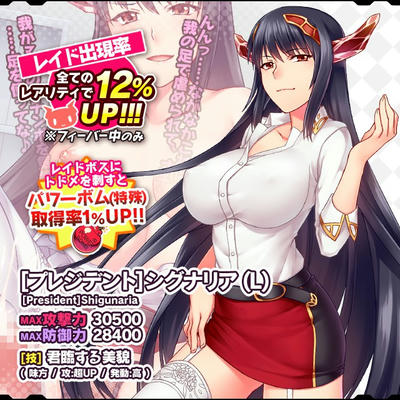 この人が欲しかったんですよ、もしかしたらここか、レアレイドでげっとできるんじゃないかな?て。このゲームを始めたころに出てた、イベントボスのアラサーのおばグシャ!・・・なんですけどもね、今回リメイクできたので、もしかしたらと淡い期待をしたんですが・・・課金ガチャでした(涙 ま、まぁ半年位したら、無課金のチケガチャから出る可能性もあるんで、それを気長に待ちますかね、シクシク(涙