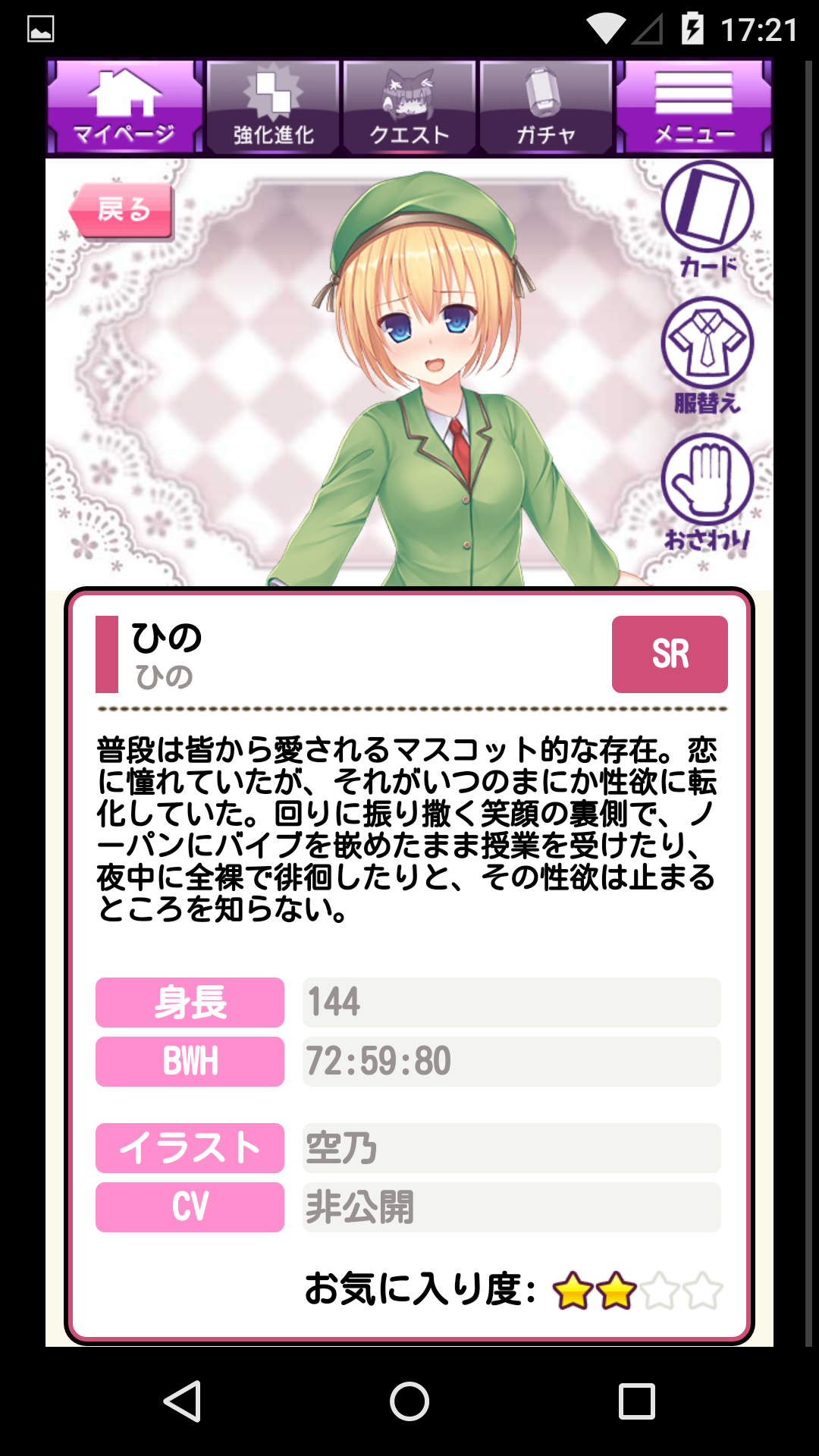 ほいで、えろモンちゃんの方は、初日に走りすぎたのか、イベントボスを10体獲得してイベントシナリオ終わっちゃいました。最速かもしれませんwwwで、右のは今回のガチャや達成ボーナスで1枚ずつもらえる、プレイヤーが履歴書(?)みたいのを作成して作るコンテストみたいのが前にありまして、それで当選したキャラだそうです。うーん、微妙(ぉ 一応ガチャから早々に1枚、ポイント報酬でも1枚とあっさりげっとできましたwので、あまり戦力的にもどうなんでしょう、自身攻撃力超upはいいんですけど、発動率が普通て。つかえねえ(ぉ