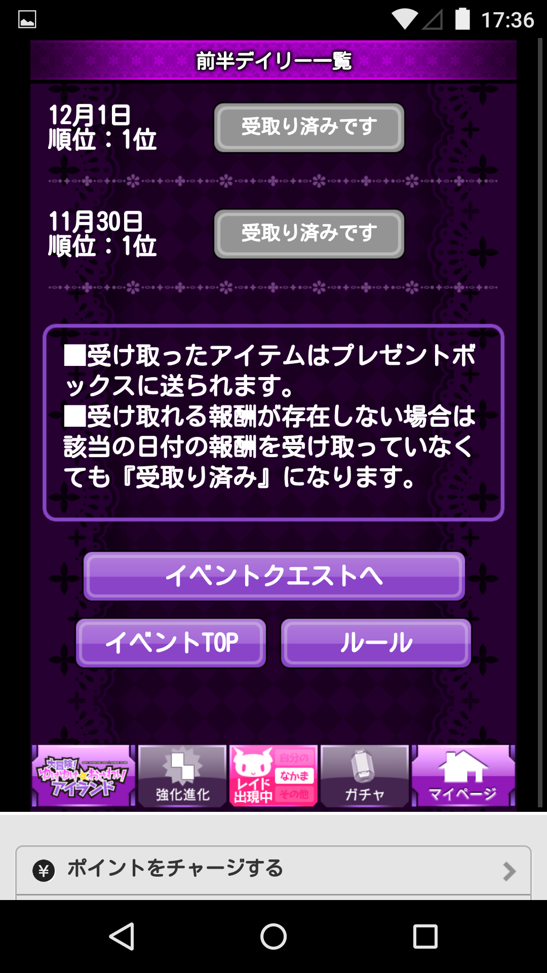 今日も、今のところは1位KEEPできております。でも100万Pごえが4名いるんで気が抜けないですねえ。今日も1位で終えられるようにがんばりますぞ!今回はちょっと頑張ってます、1回くらいできうることは試してみたくなりますからねえ。あ、無課金なんで総合順位はかなり下がってます、400位くらいかな?w