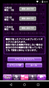 残念ながら、廃課金のアホが1名いたようで、あっという間に1000万ポイントまで加速してったんで、放置して2位を確保しました(ぉ 1位と2位とですと、もらえるイベント限定の気合薬の差が100個あるんで、1位は取りたいんですが…こういうキ○ガイと取り合いすると、次の日以降の気合薬が足りなくなって上位キープすらできなくなるんで諦めましたwまぁ、2位ならギリギリなんとかなるんでw
