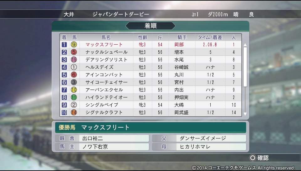 どうしてもね~、9ヶ月も走ってなくてイキナリ走って54キロのハープスター負かせるとは思えないんですよね。幾らダービー馬とは言え。てか、この馬日本ダービーしかG1勝ってないのに人気しすぎなんですけど(汗 ワンアンドオンリーと一緒では?とか思っちゃったり。まぁ、G2は勝ちまくってますけどもw