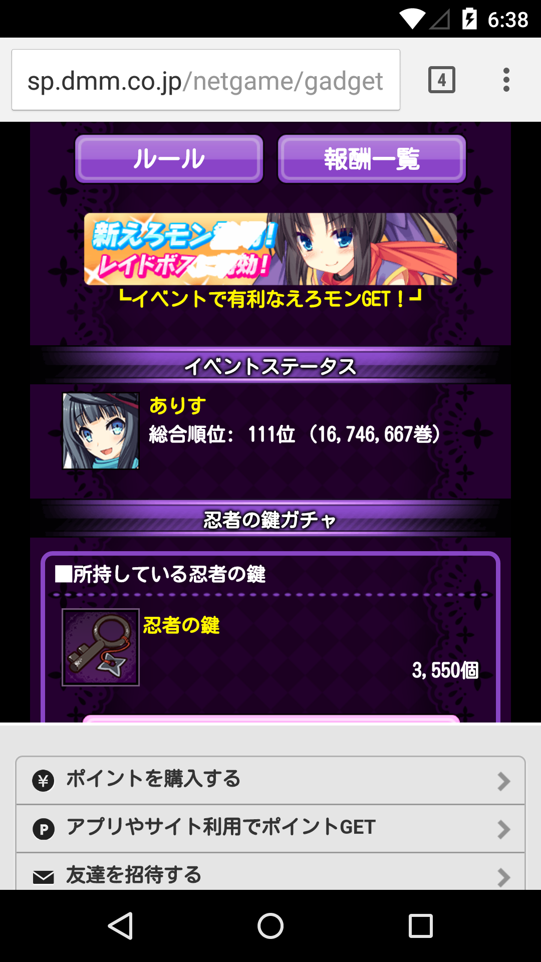総合ランクが112位とかまで行ってしまいました(汗 ちなみに、前回のイベントは前に書きましたが5000位報酬が欲しかったのに、5300位くらいで終了でした。どうせこのあと一気に追い込み掛ける人たちも居るし、僕の持ってる行動薬の予備も少なくなってきたんで、500位報酬は多分無理でしょうwでも5000位は今回は大丈夫そうな気がしますw