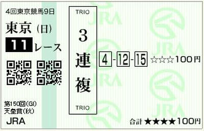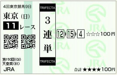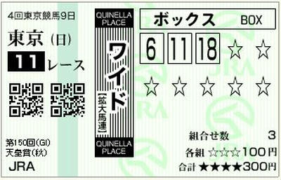 幹夫厩舎→1人気→ヒロシの、2005年の天皇賞になぞらえた、3連単と、順番違いでもいいように3連複。3連複でも2万円になるので、ワールドエースの補填にはなるかなとw