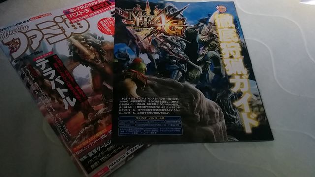 ファミ通無事に届きました~。今週は明後日土曜日に出るモンハン4Gの特集でした。100Pもある読みごたえ十分な付録付きで大満足!