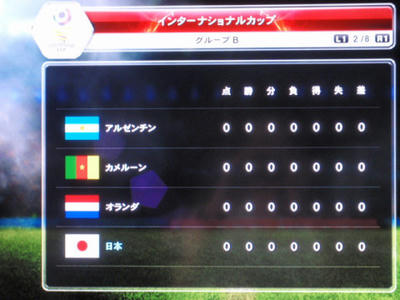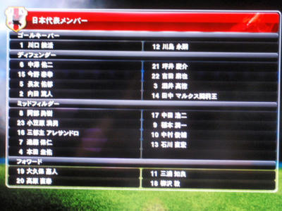 カードマンのお兄さんがひとりずつ、「ゴールキーパー!!ナンバー1!」とポジションと背番号を読んでくれます。ちなみに、デフォのW杯メンバーですと、そのあとに「けいすけーー、ほんだぁ!」みたいに名前も呼んでくれました。残念ながら俊輔やカズさんなどは呼ばれず。コンマイバカヤロー!!!<どっちなの?(ぉ でもこれで、他の選手は呼ばれないのに何故かカズさんだけ呼ばれたりしたら痺れましたけどね、さすがにそこまではできなかったかー、残念w