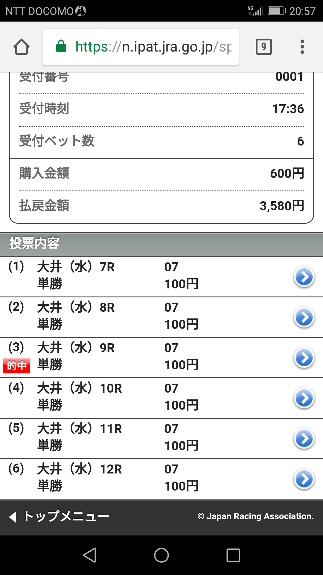 明日の中央で頑張ろう・・・。なんか、悲しい思いをしたくないので、最初から7→2→1の3連単にします!どっかでこい!(ぉ