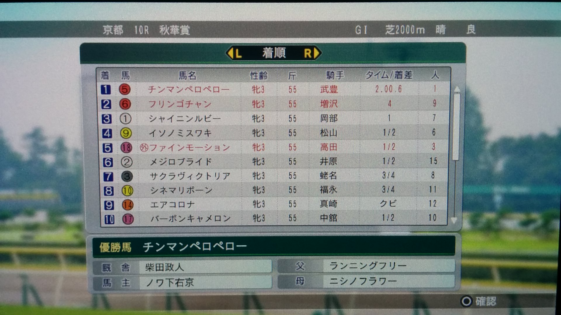 ウイポ8。自家生産のチンマンちゃんが、フリンゴチャンを抑えて秋華賞勝ちました!ちなみに、フリンゴチャンはSPが4なんですけど、成長型が晩成です(汗 ファインモーションはもうおしまいかな(ぉ