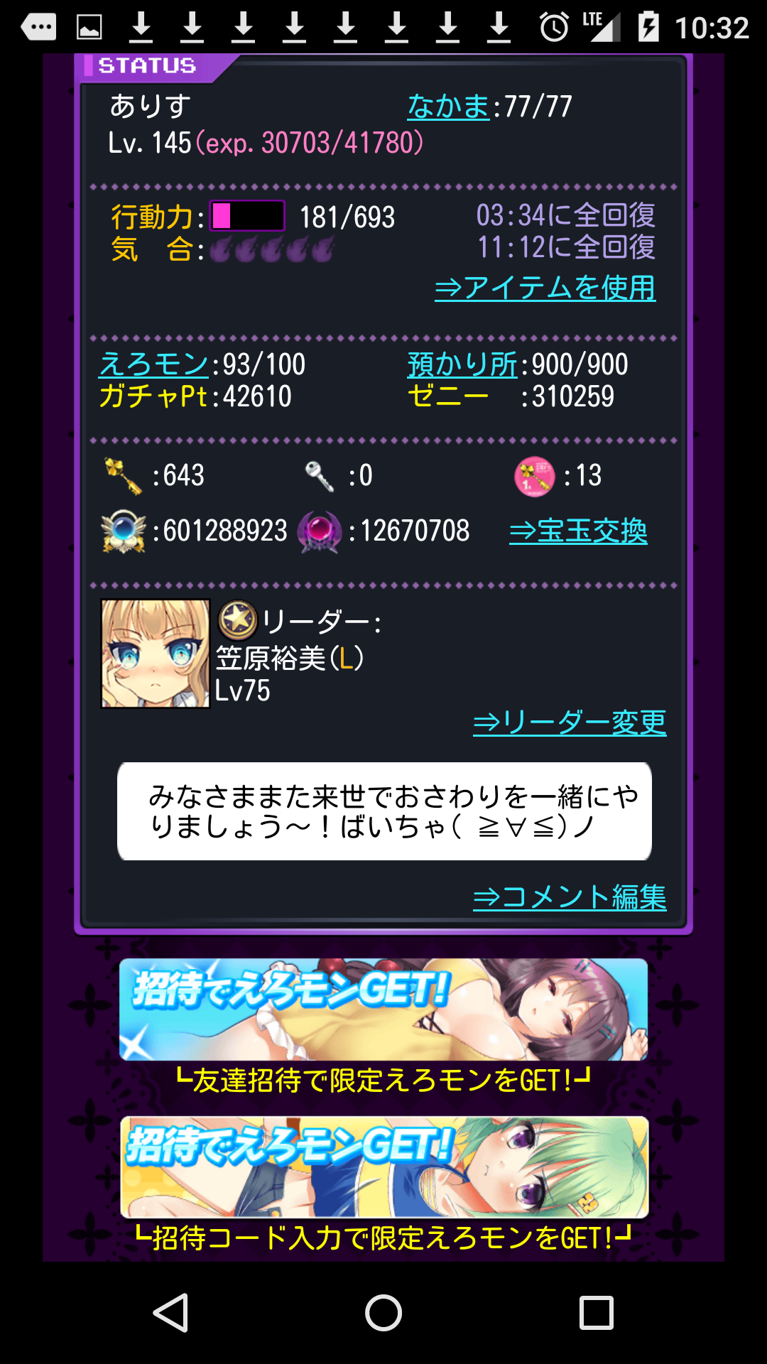 最後の一言はこんな感じにしました。フレンドの人とかが見るやつですね。レベルが145かぁ。メッチャやりこんでる人がいてその人は300で止まってたんで、300がカンストだったのかもしれません。