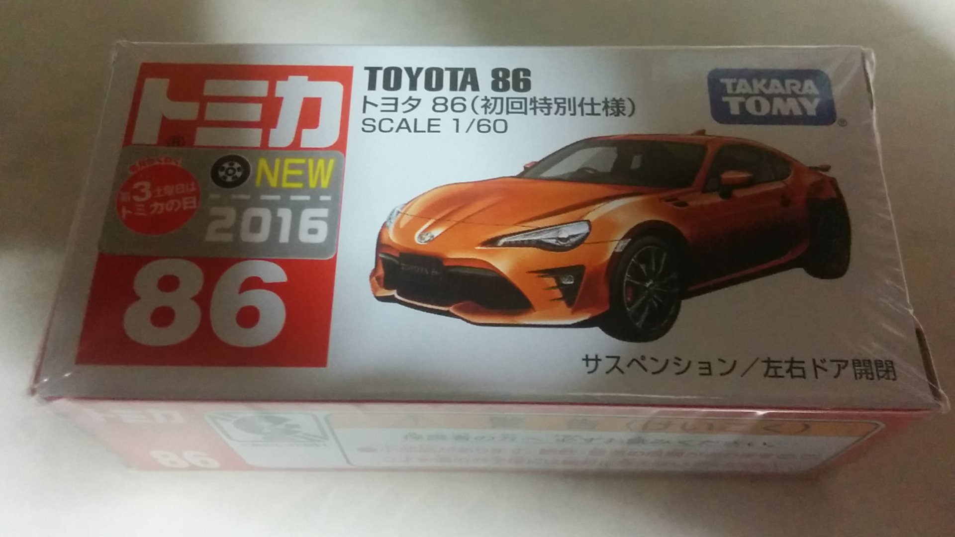 ほいで、今月最後のお買い物はコレでした。トミカの、TOYOTA86ですね。藤原豆腐店で有名なAE86の現代版といいますか、そんなマシンです♪ミニカーってこどものおもちゃ&安いので、写真詐欺が多いのでこれはどうかなあと思いましたけど、けっこうかっこよかったです!買ってよかった。