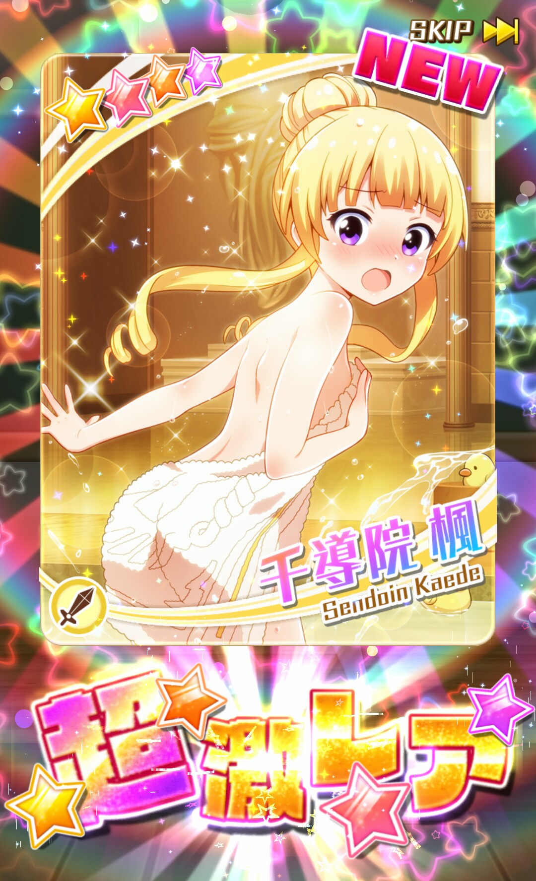今日から、またお風呂ガチャが来たので、超久々に1回引きましたが、お目当ての楓お嬢様のバスタオルはだけ絵のはげっとならず!昴君と花子アゲハでした(ぉ しかし、昴君は色気ないですなあ、他のキャラで同じポーズならハアハアものなんですけどグッシャ(ぉ