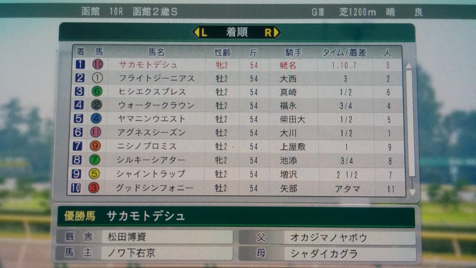 ウイポ8はエルムSで所有馬のメイセイオペラが、アブクマポーロやウイングアローを7馬身位ぶっこぬいて勝ったのと、3歳のアドマイヤベガ、テイエムオペラオーを子供扱いしたモンジューをキングジョージでスペシャルウィークでぶっこ抜いてやって気持ちE~!!!て感じでした。マジでモンジュー鬼強だったんでさすがにスペでも負けちゃうかも!?と思ったんですけどねえ、ガハハ!(ぉ ちなみにモンジューは離れた3着で2着はデイラミでした(ぉ